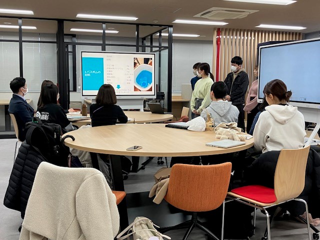 令和6年2月に行われた授業の最終報告会を取材しました。この授業では、障がい者の就労施設でのグッズづくりやカフェの改装案について企画提案を行うべく、4人×2チームが奮闘。各チームのリーダーとして活動した2人からお話を聞きました。