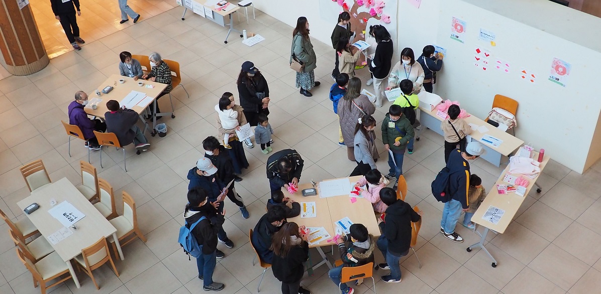 Mさん:子どもから大人までできるスタンプラリーと、好きなことなどをいろいろな人と話すカフェスペースの2つの企画が主になっていて、スタンプラリーで回るワークショップとして、桜の枝を描いた壁面装飾に、紙で作った花を飾るワークショップや、ペットボトルを使ったボーリングや輪投げ、医療系の施設が並ぶ3階でクイズの答えを探したり、43階の展望スペースで写真を撮ってきたりするミッション等を組み合わせたイベントになりました。